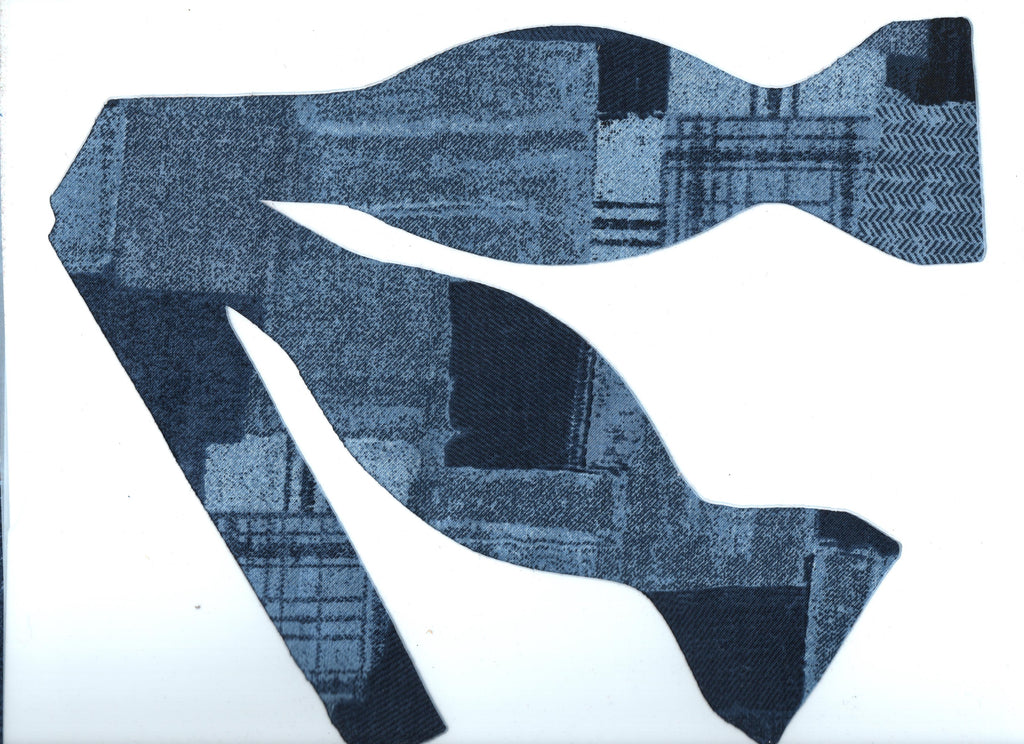 This cotton bow tie features a pattern resembling patches of denim in varying sizes, shapes, and shades of navy blue. From dark selvage portions to frayed, faded patches, it's a beautifully eclectic fabric!